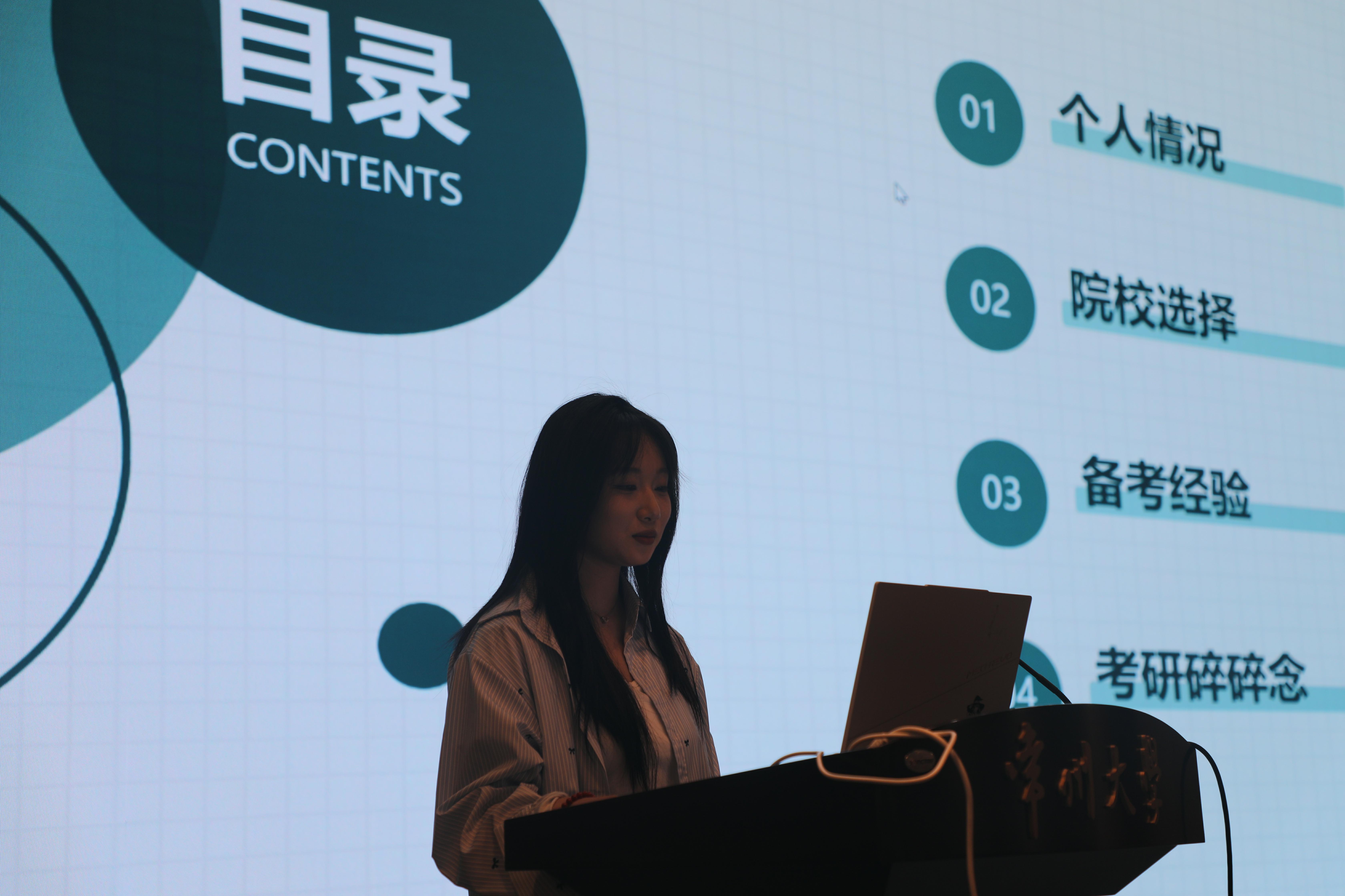 在分享环节,304am永利集团官网准研究生李依莀和南开大学准研究生王思影从考前复习规划、目标方向选择、报考志愿填报等方面进行了详细讲解。她们强调了明确目标的重要性,并结合自身经历,为同学们提供了实用的备考建议,包括如何合理安排学习时间、如何应对备考压力等。